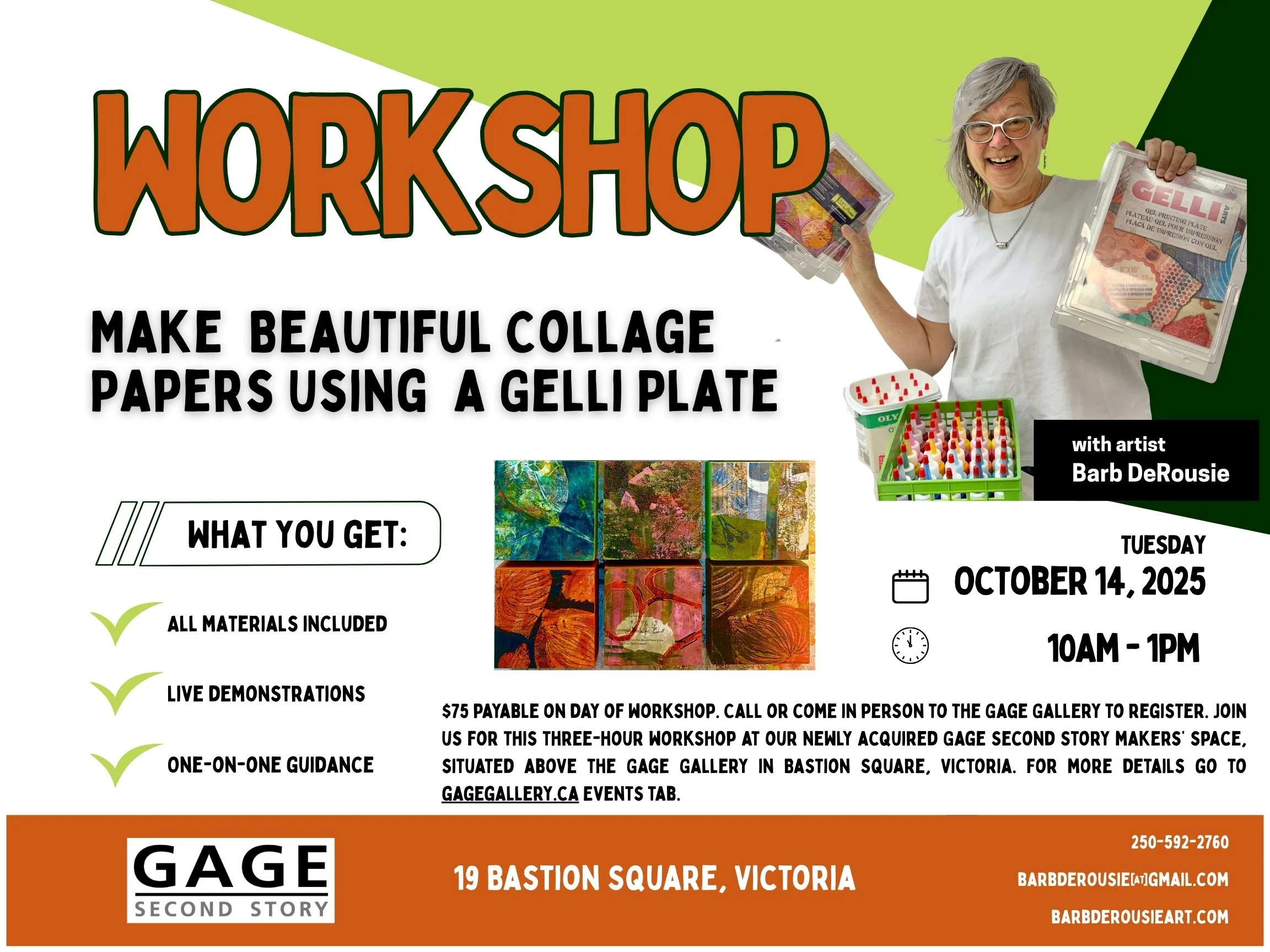 Join us at the Gage Second Story, the Gage’s newly acquired artist studio and workshop space! This fun workshop teaches monoprint techniques using acrylic paint and various papers on a Gelli plate. All materials are included, but you can bring your preferred papers, paints, stencils, or stamps. Reserve your spot with your name, email, and $75 plus tax (payable in person or by calling 250-592-2760). Free parking in the Yates Street parkade.