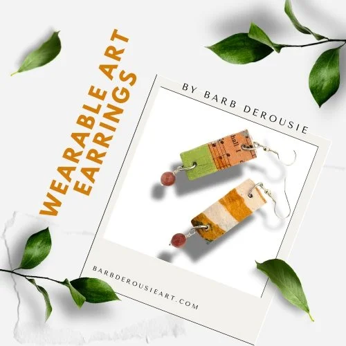 Wearable Art Earrings & More… “Warm Thoughts” Mini Art Blocks - $40 each These are acrylic and mixed media abstract designs painted on 4” x 4” birch panels sealed with archival varnish. Great for small spaces and make unique gifts.